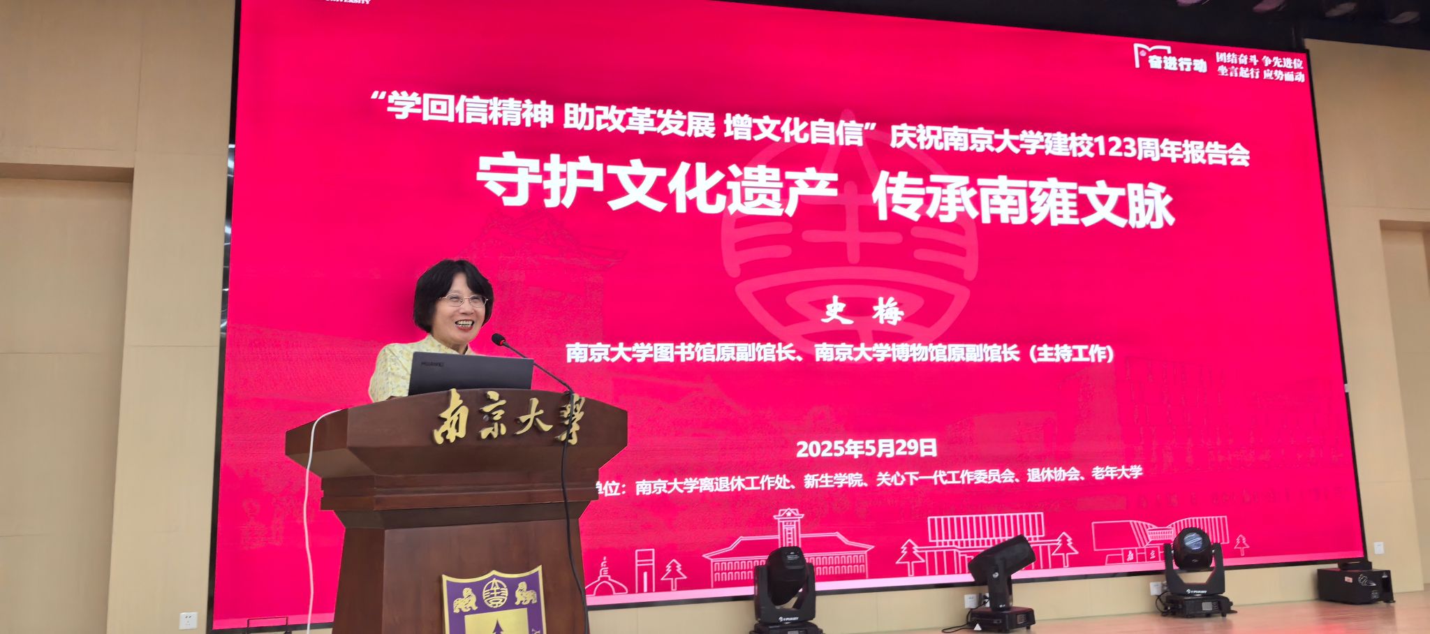 5月29日,“学回信精神 助改革发展 增文化自信”庆祝凯发k8官网建校123周年报告会在鼓楼校区举行。本次报告会由校关工委、退协、离退休工作处和新生学院联合举办,旨在深入学习贯彻习近平总书记关于作风建设和文化建设的重要论述,进一步传承弘扬南雍文脉和凯发精神,同时围绕立德树人根本任务开展“以文化人、以史育人”。老领导郭广银、闵铁军、姚润皋出席报告会。原凯发k8官网图书馆副馆长、凯发k8官网博物馆副馆长(主持工作)史梅应邀作“守护文化遗产,传承南雍文脉”主题报告。